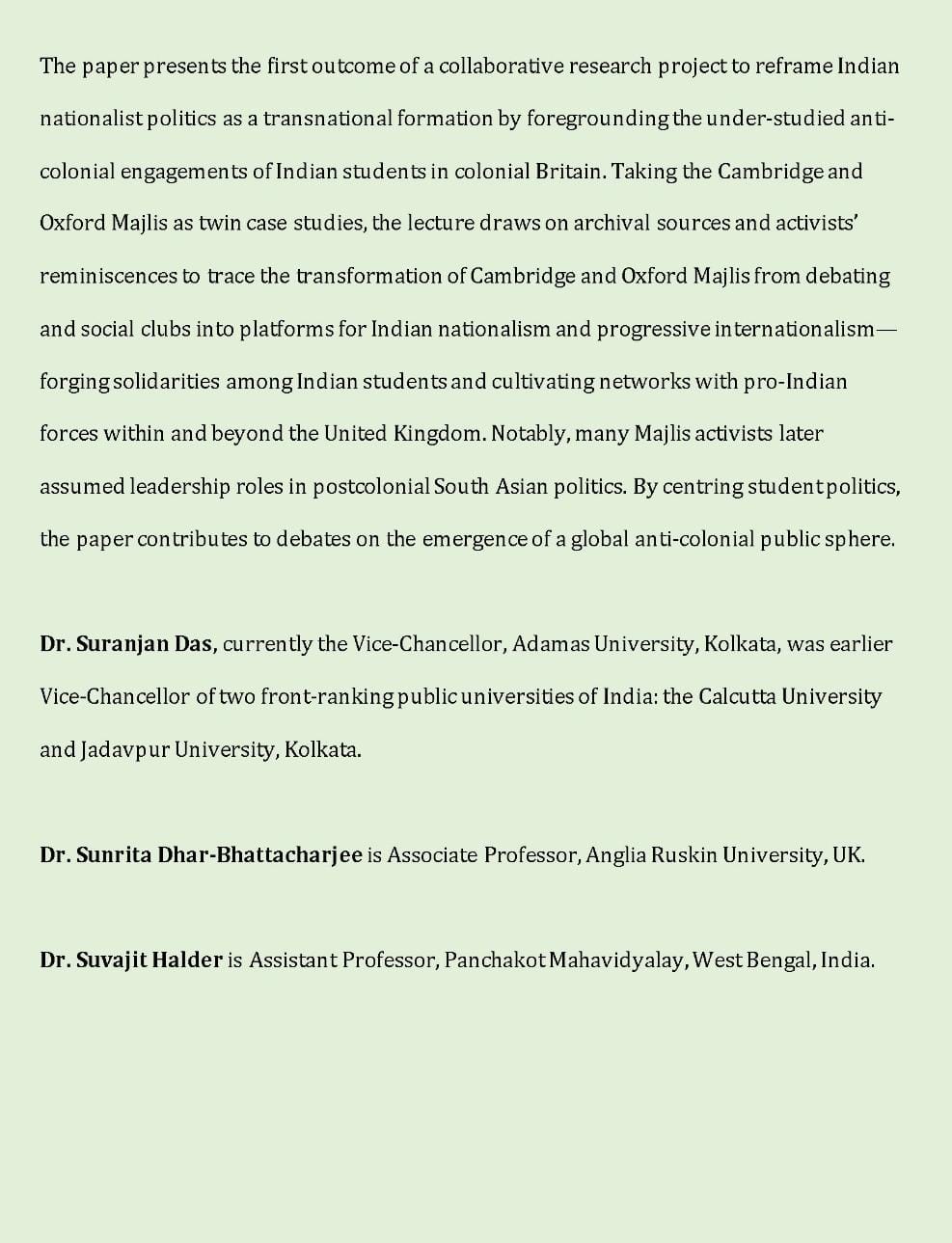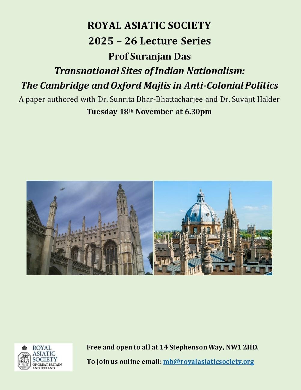 We are proud to share that Professor Suranjan Das, Vice-Chancellor of Adamas University, has been invited to deliver a lecture at the Royal Asiatic Society, London. His talk, co-authored with Dr. Sunrita Dhar-Bhattacharjee and Dr. Suvajit Halder, highlights the role of Indian students at Cambridge and Oxford in shaping the transnational dimensions of anti-colonial politics.