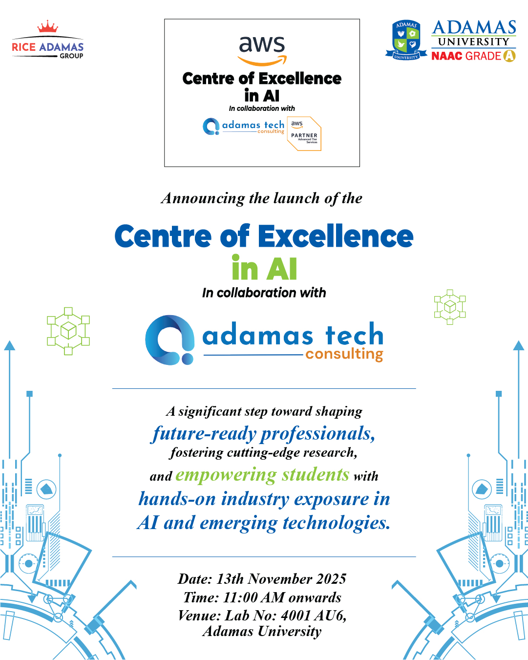 Adamas University, in collaboration with AWS and Adamas Tech Consulting, is proud to announce the launch of the Centre of Excellence in AI. This initiative marks a major step toward shaping future-ready professionals, driving cutting-edge research, and empowering students with hands-on industry exposure in AI and emerging technologies.